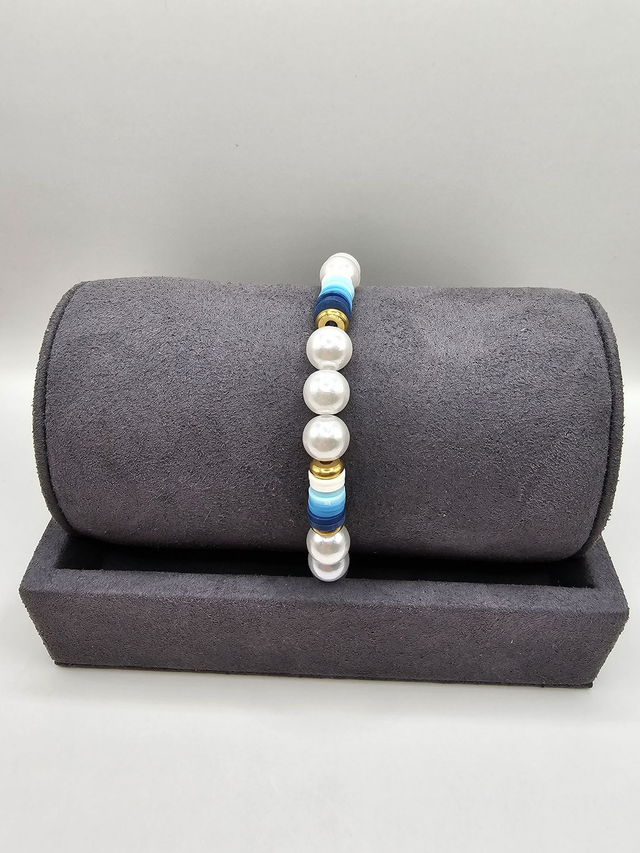 This Heishi clay bead and faux pearl bracelet is the perfect accessory to add to your jewellery collection. The design features blue & white Heishi clay beads & gold tone spacers, contrasted with faux pearls.