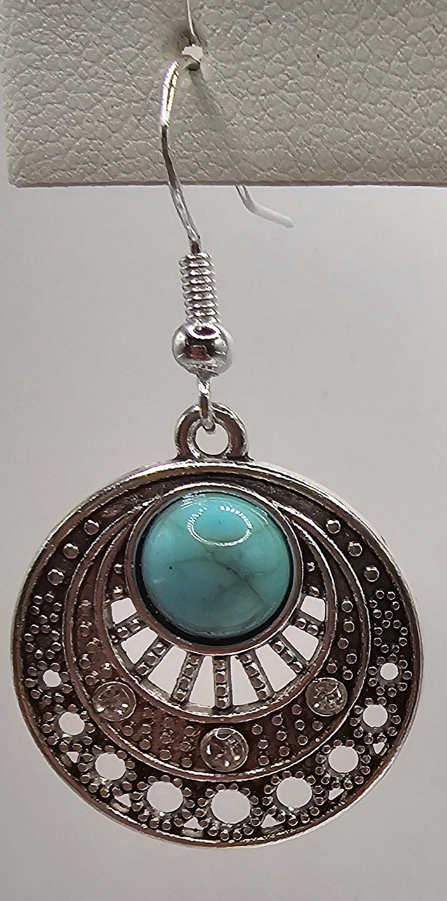 These earrings will elevate any outfit and make a lasting impression. The delicate faux turquoise beed captures the essence of serenity, & three rhinestones add a touch of sparkle to your style.